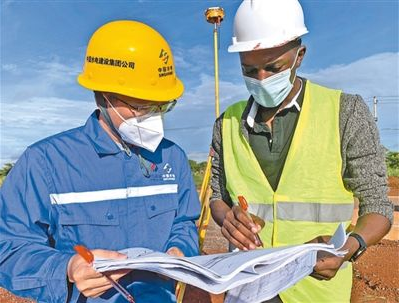 在乌干达卡鲁玛水电线路站作业活动现场,中乌两人之间过程师在座谈作业施工图纸。孙 菁摄(国内 电建供图)
